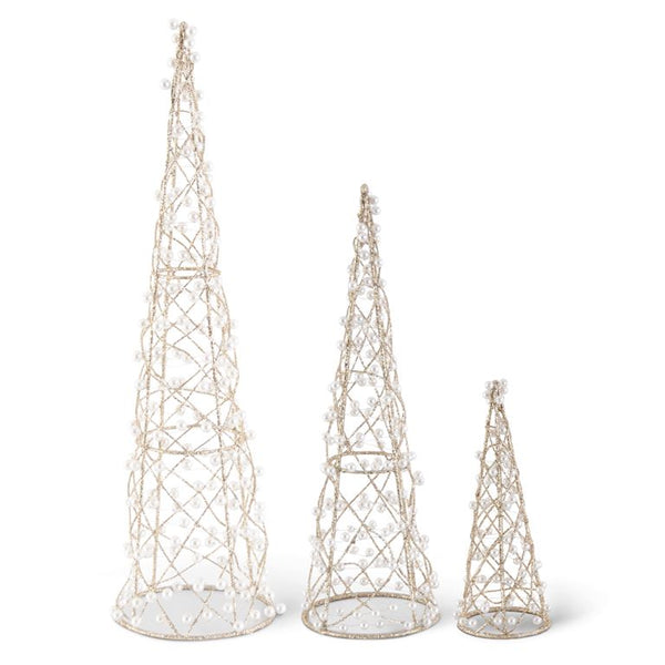 Set of 3 Gold Glittered Cone Trees with Pearls