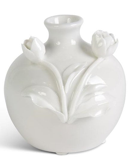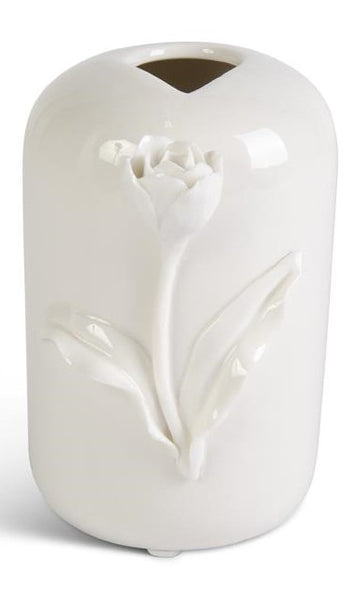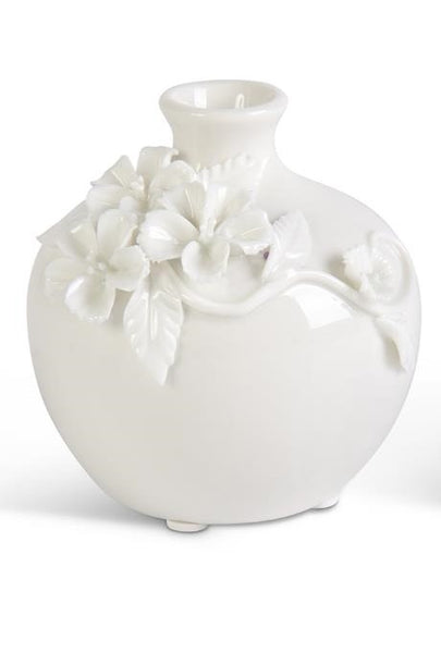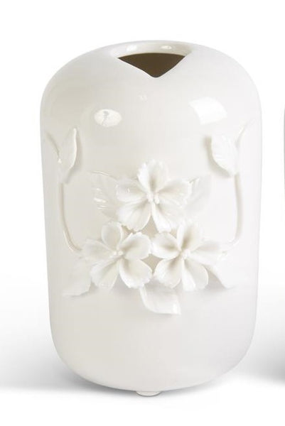 • Short White Ceramic Vase with Raised Flowers